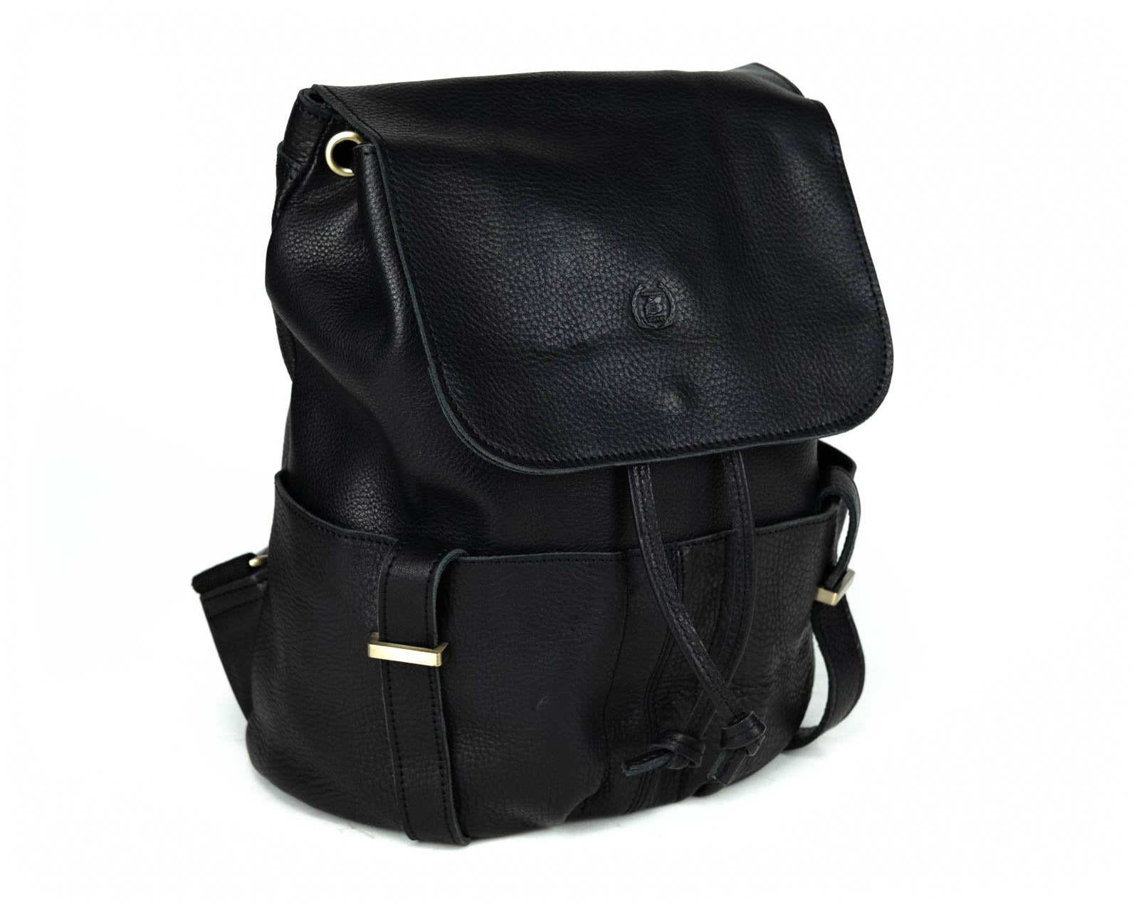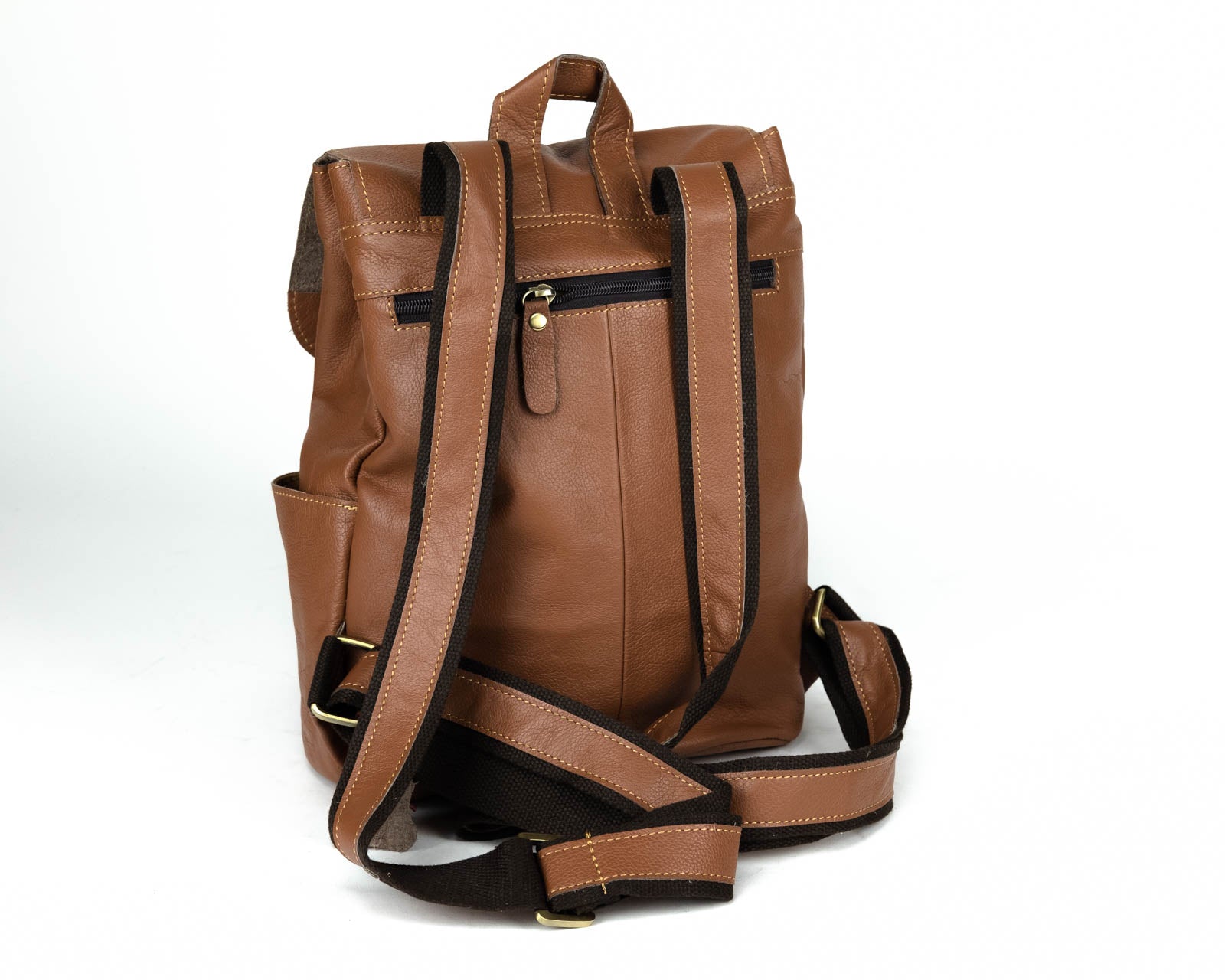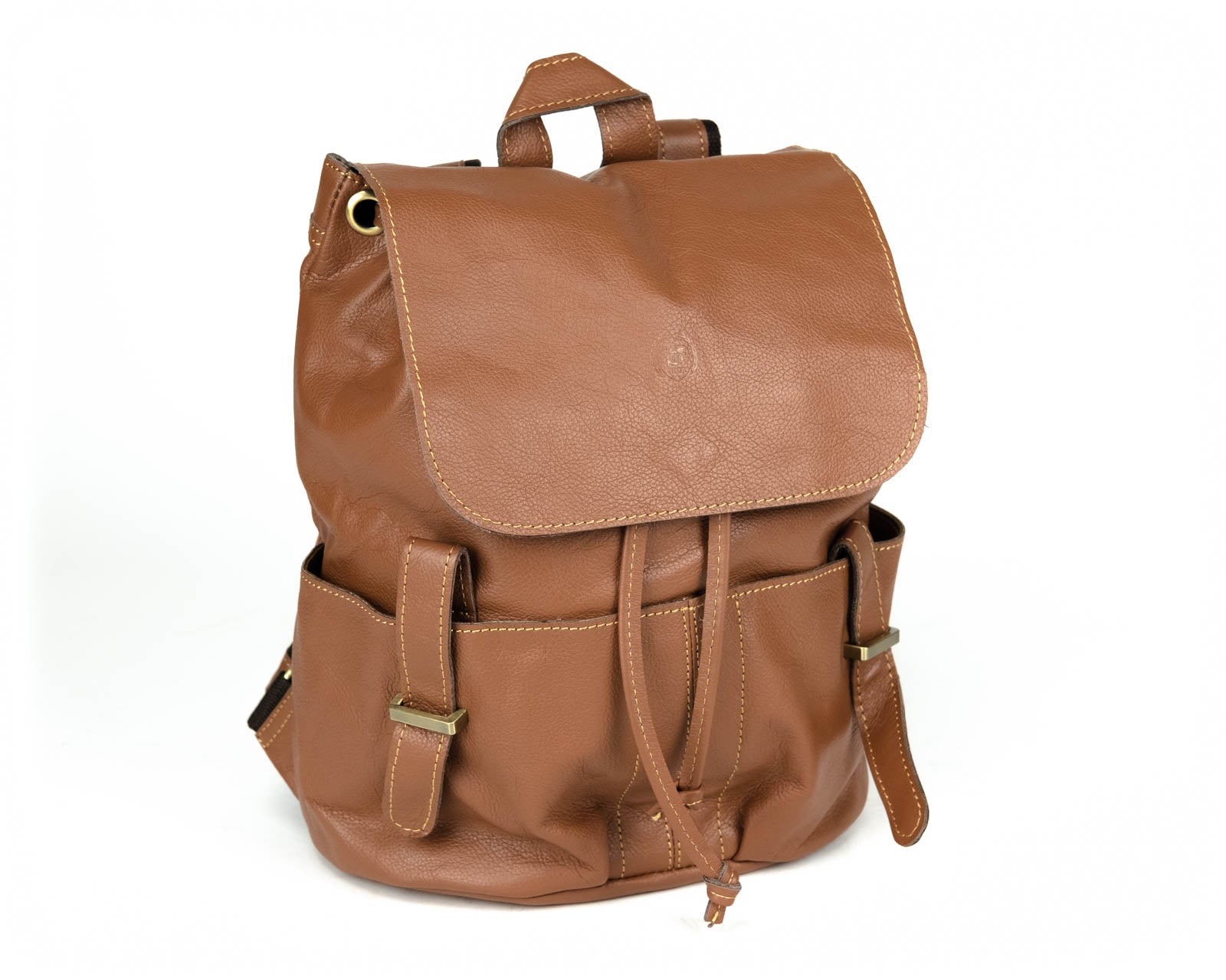 Beautifully handcrafted with genuine Leather and brass coated hardware. Two front open pockets and a zipper pocket on the back. Draw string and flap with magnetic brass button closure. Beautiful canvas interior with two open pockets and zipper pocket. Great for everyday use, travel or business.