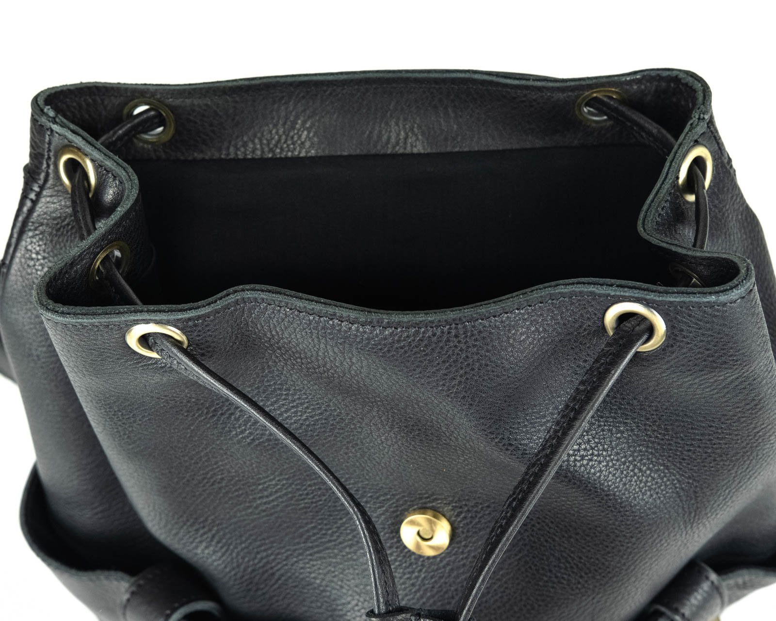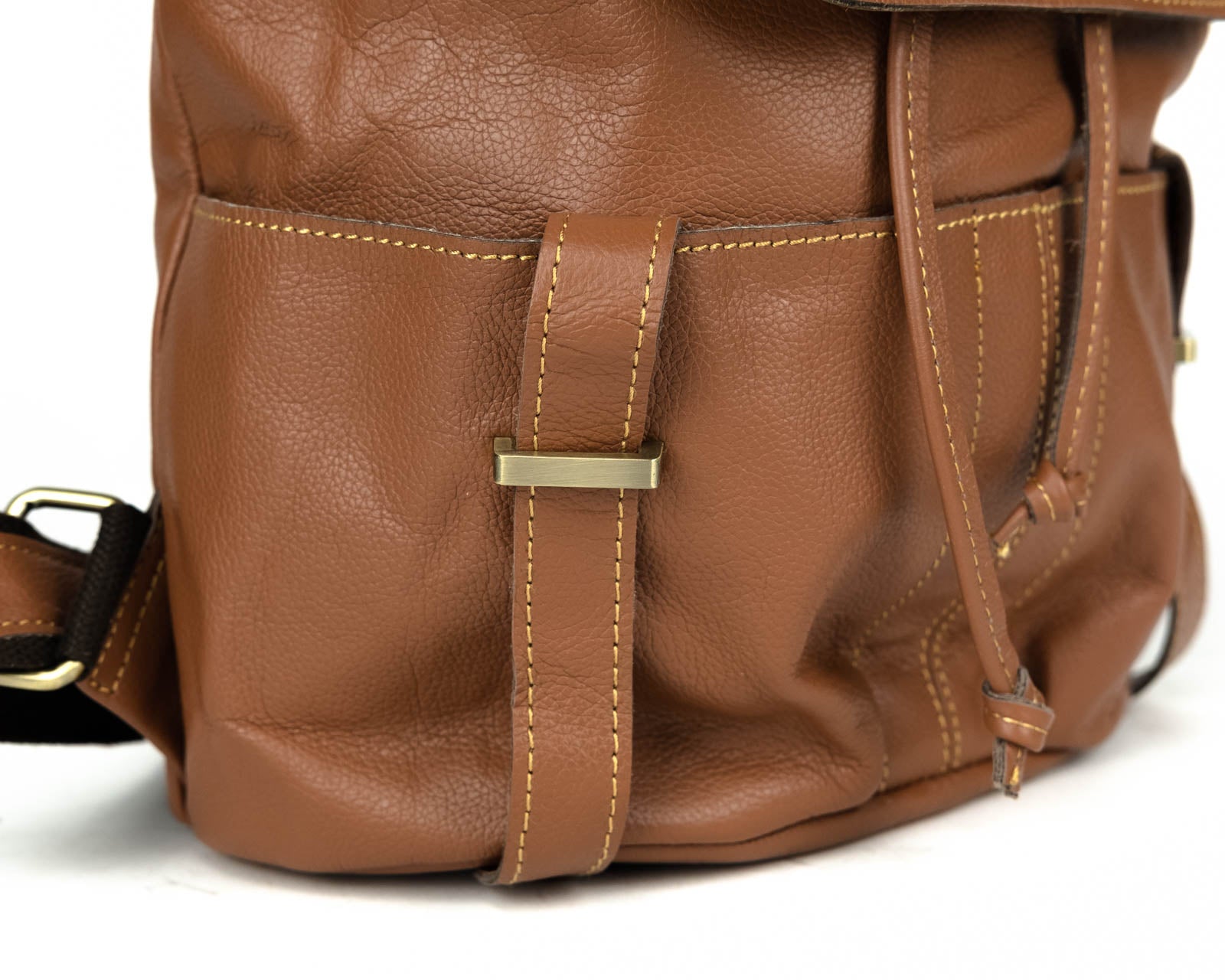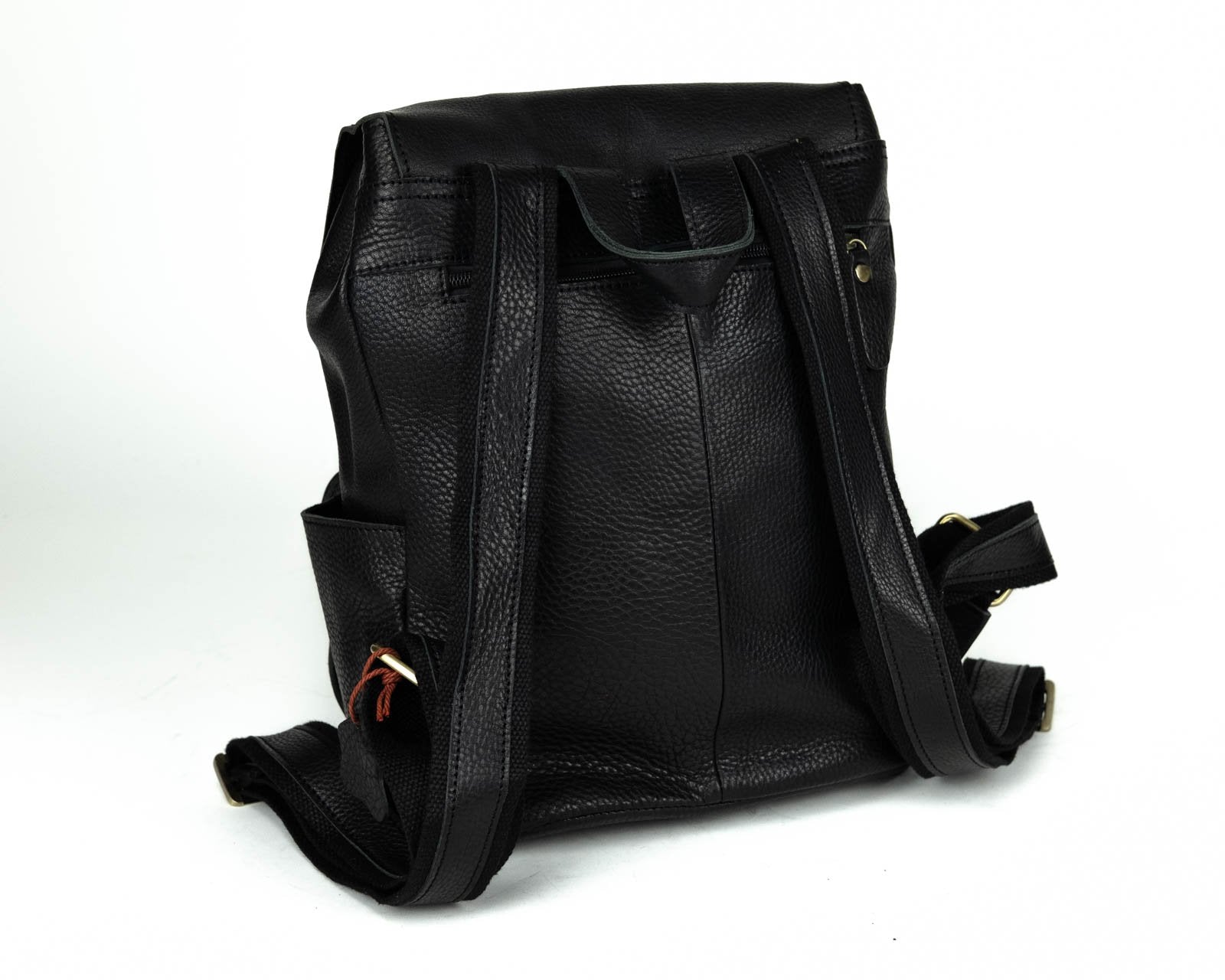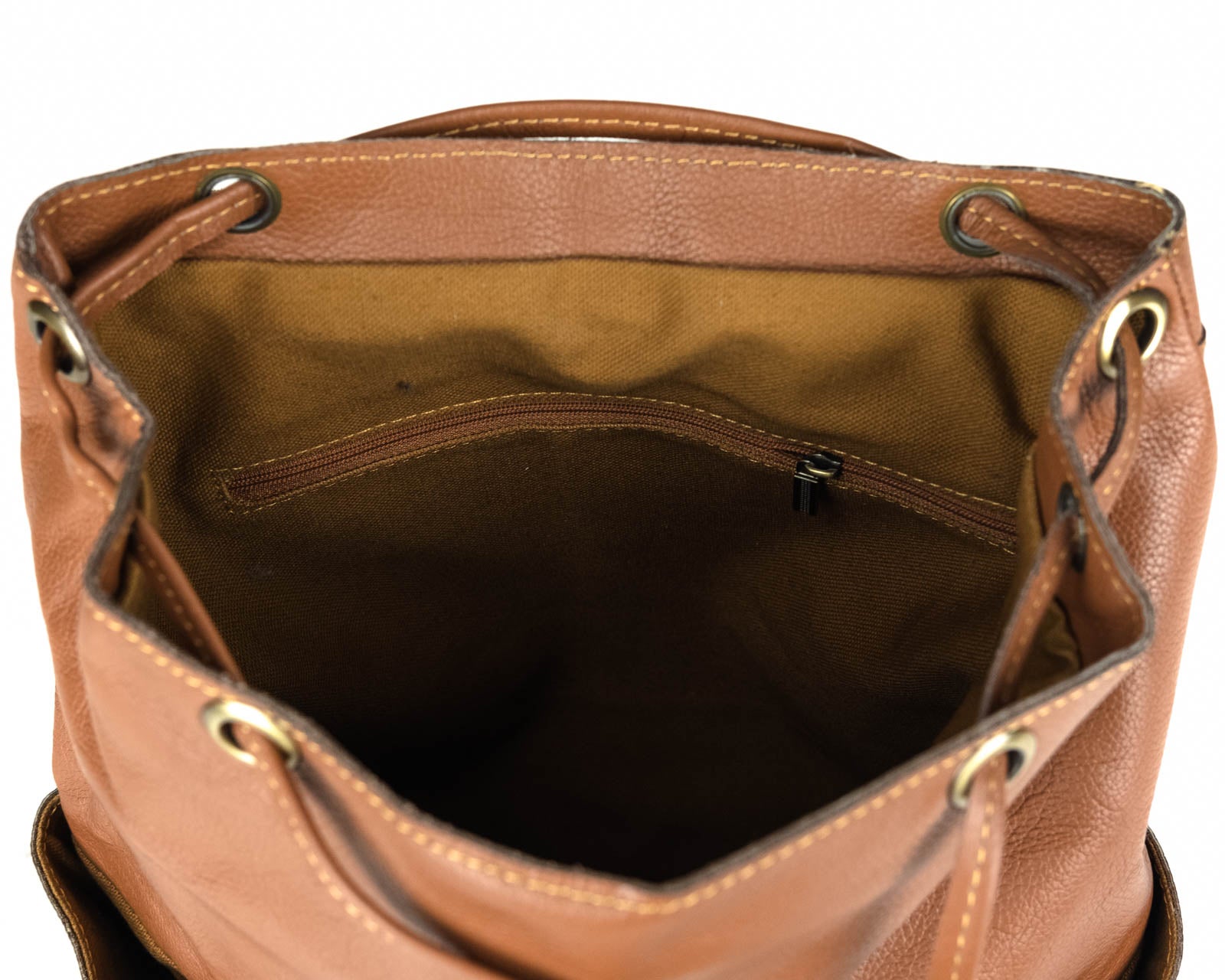 Beautifully handcrafted with genuine Leather and brass coated hardware. Two front open pockets and a zipper pocket on the back. Draw string and flap with magnetic brass button closure. Beautiful canvas interior with two open pockets and zipper pocket. Great for everyday use, travel or business.