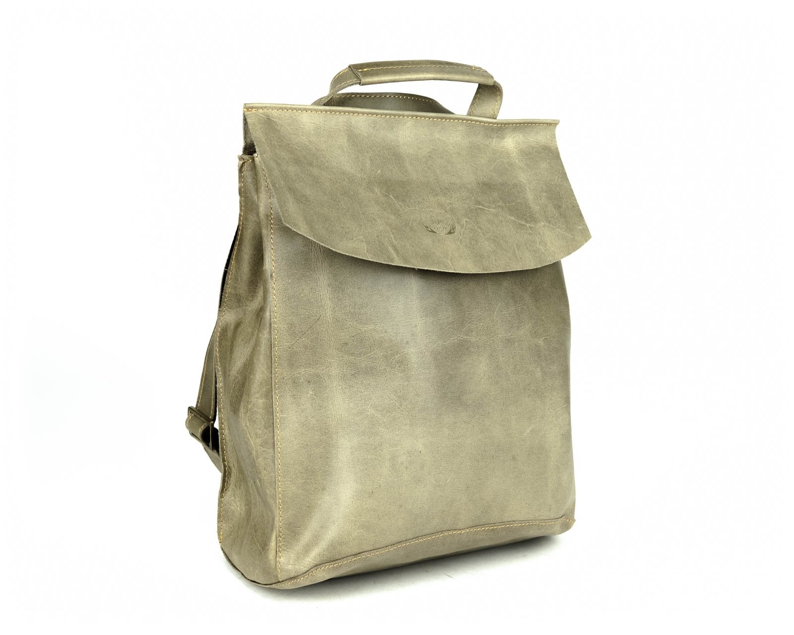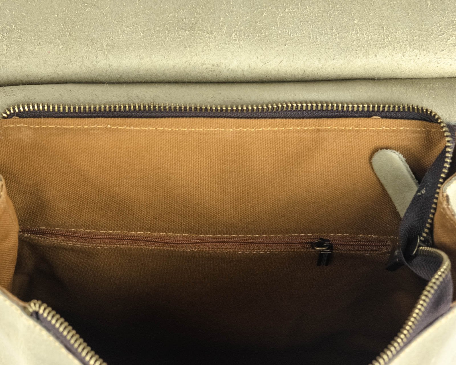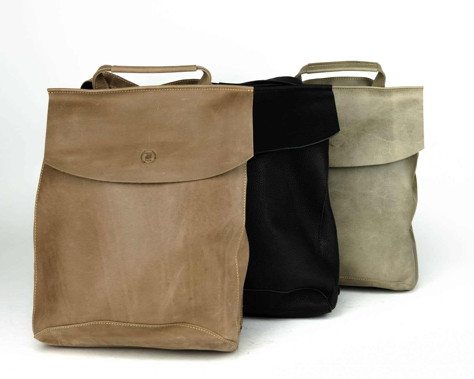Our multi-functional backpack has many ways to be worn. Made from genuine leather, it is built to last. You can use it as an everyday backpack, or by pulling the strap up from the back, it forms from a two strapped backpack into a crossbody. There’s a single leather handle on the top of the bag as well if you want to hold it by hand. With an outer zip pocket on the back, there’s also snap buttons on each side of the bag to open and expand it’s size. When opening the leather flap of the backpack, there is a zipper opening that’s lined with canvas as well as a zipper pocket and two open pockets. This bag is great for business, school, travel or your everyday go to.