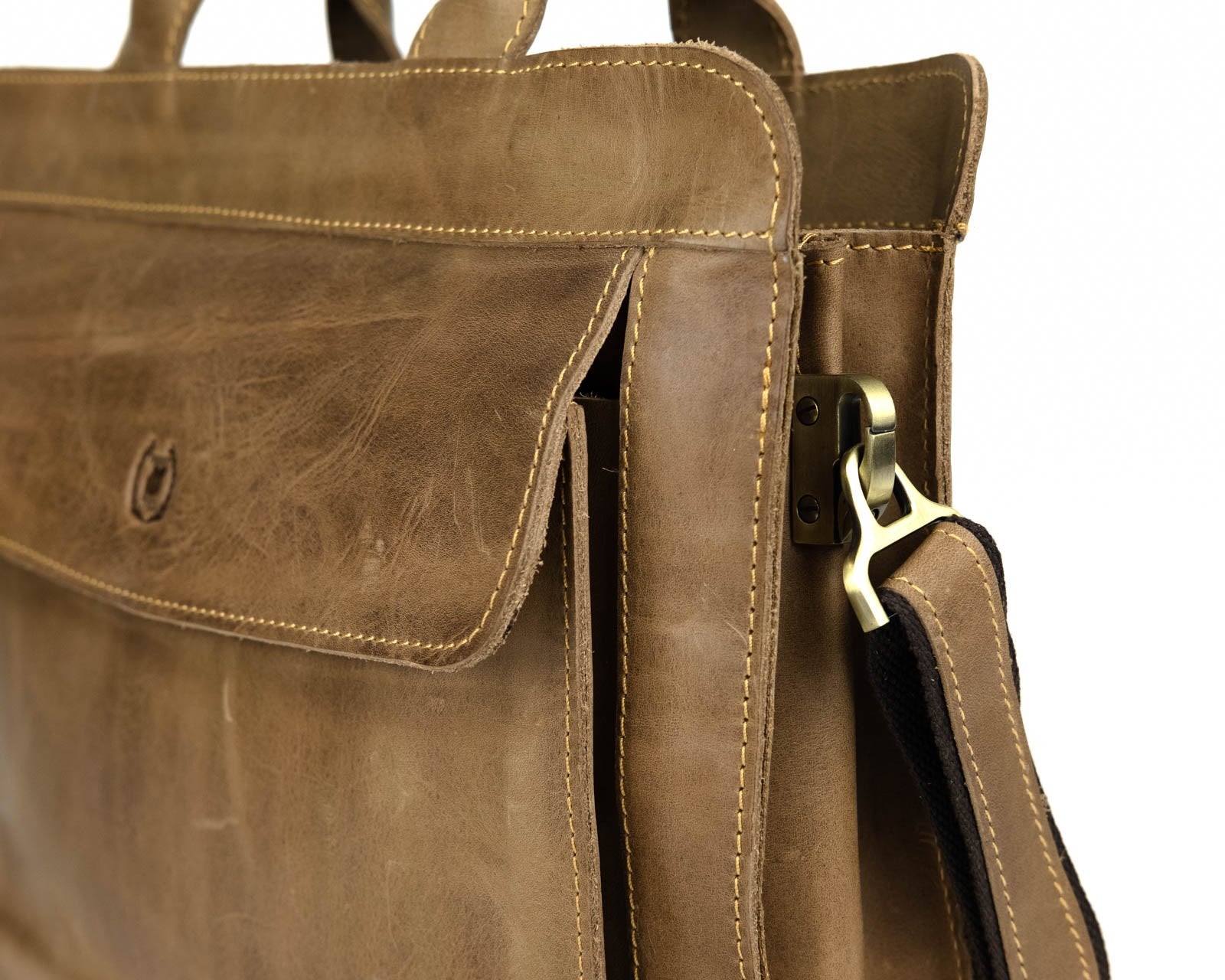 Beautifully handcrafted with genuine leather and brass plated hardware, Elliot Briefcase has a large front pocket with brass plated magnetic buttons and a zipper pocket on the back. Two handles for easy grab and go convenience and an adjustable strap for a hands free crossbody. Inside of the briefcase is a canvas lining with a closed zip that separates the briefcase into two compartments, easy for storing files or securing your tablet. This is a great briefcase for any business meeting or business travel occasion.