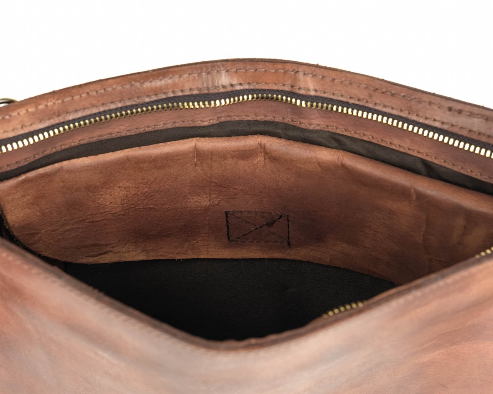 Beautifully handcrafted with genuine Leather and brass plated hardware. With an adjustable strap and full zipper closure, the interior has beautiful canvas and two pockets, one with a zipper and the other with a Velcro envelope pocket. Great for everyday business needs and traveling.