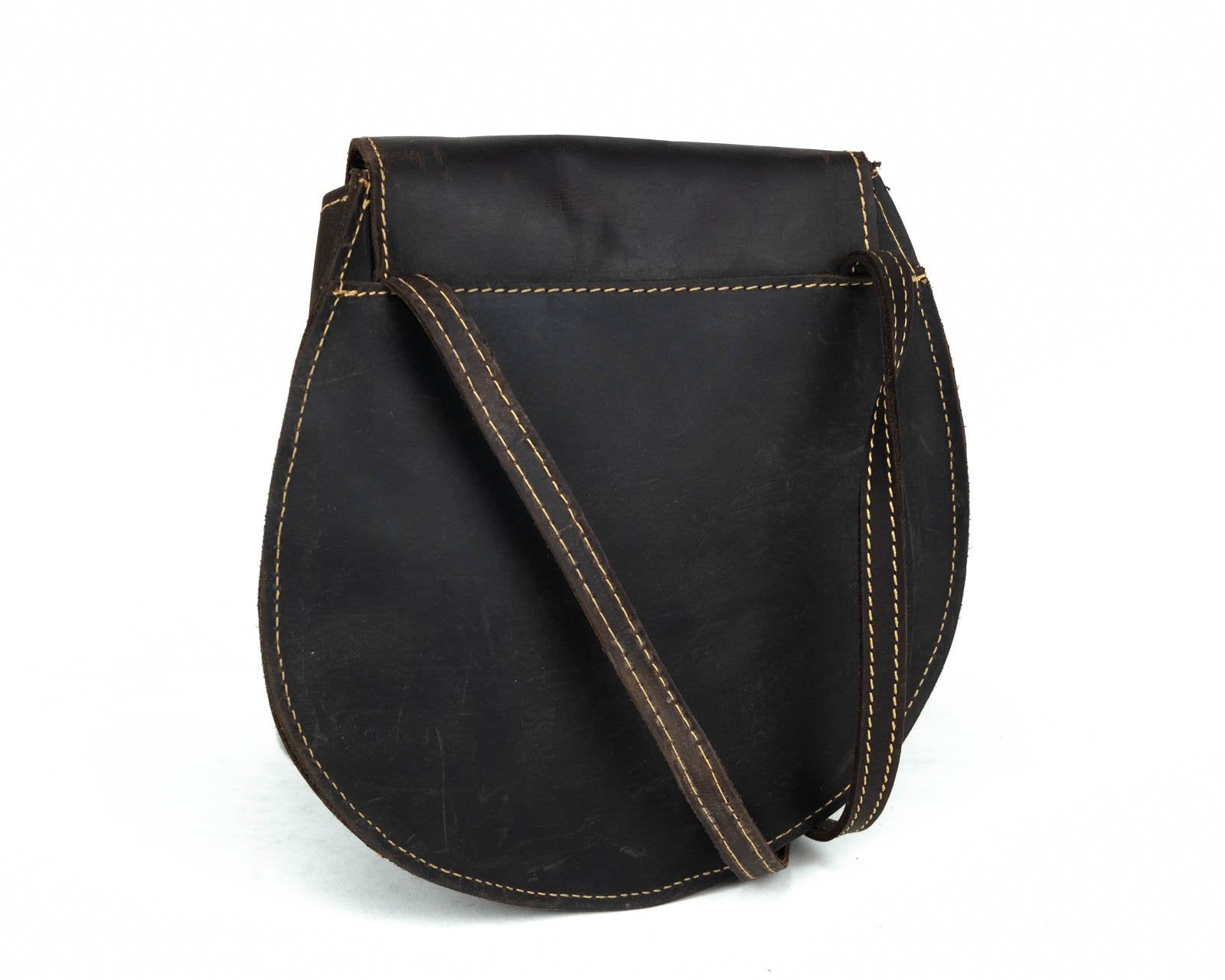 Beautiful handcrafted with genuine leather and brass plated hardware, The Brittany Saddle Bag has an adjustable leather strap and closes securely with a brass push lock. All leather interior with an open pocket. This is great for traveling or everyday use.