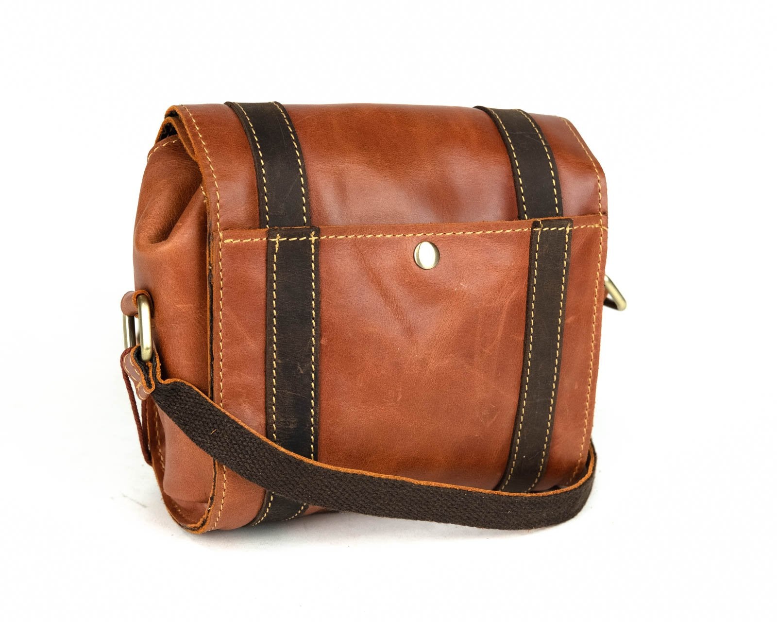 Our camera bag is made with genuine leather and brass coated hardware. Easy to use snap buttons securely close the bag, with additional storage space in the outer pocket sporting a button snap feature for your go-to items. The interior is made with canvas and two side pockets for extra camera storage. This is the perfect camera bag to travel with or use for business.